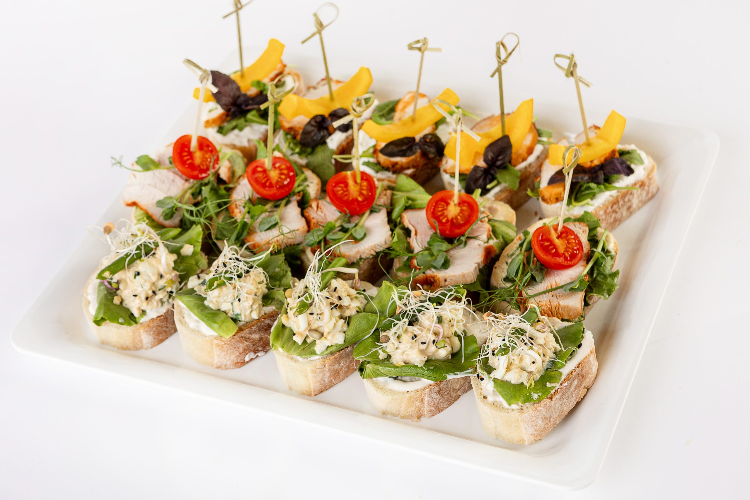 5 x Crostini z pieczonym indykiem, sosem musztardowo-miodowym, pomidorkiem koktajlowy i kiełkami groszku