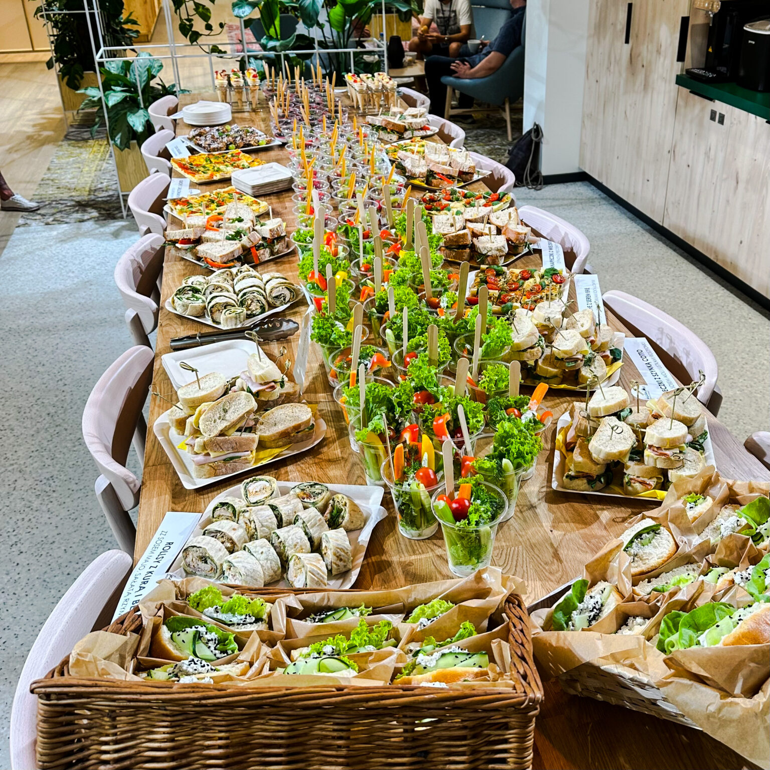 Nasza firma cateringowa dostarcza również przepyszne i sycące zestawy śniadaniowe oraz na lunch. Ich skład zależy od twoich preferencji i wymagań, mogą to być np. bajgiel, mini sałatka, sok owocowy, ciasteczko czy też wrap, croissant z konfiturą i sok owocowy. Niezależnie od tego co wybierzesz, nasz zestaw pakujemy w ekologiczne opakowanie, wszystkie produkty są opisane, a wewnątrz torby znajdziesz niezbędne jednorazowe sztućce i serwetki. Wręczenie takiego zestawu uczestnikom szkolenia, czy też spotkania biznesowego to miły gest, który podniesie poziom twojego eventu.
